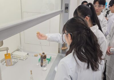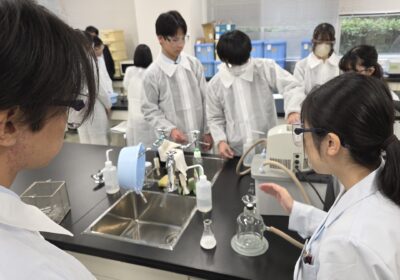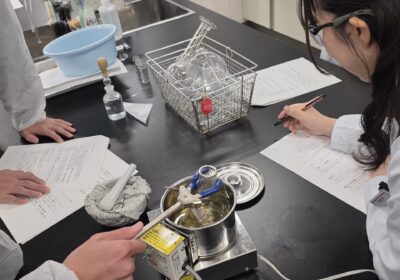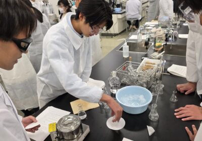 今回は薬剤師体験ということで、薬剤の合成と抽出を体験させていただきました。教授の方々や、実験のサポートをしてくれた学生さんたちによるわかりやすい説明もあり、生徒たちも楽しみながら実験に参加している様子がうかがえました。大学の授業でも使用される薬品や機材を使わせていただける貴重な機会ともなり、生徒たちは興味津々でした。生徒たちも意欲的に実験に取り組み、先生方からもお褒めの言葉をいただくことができました。