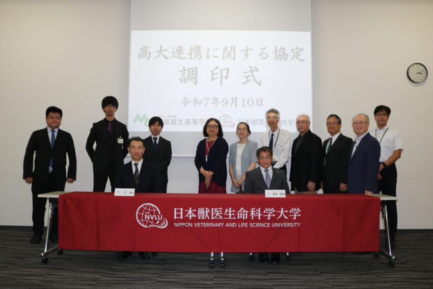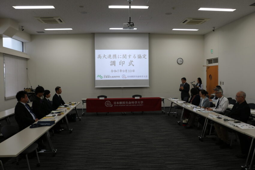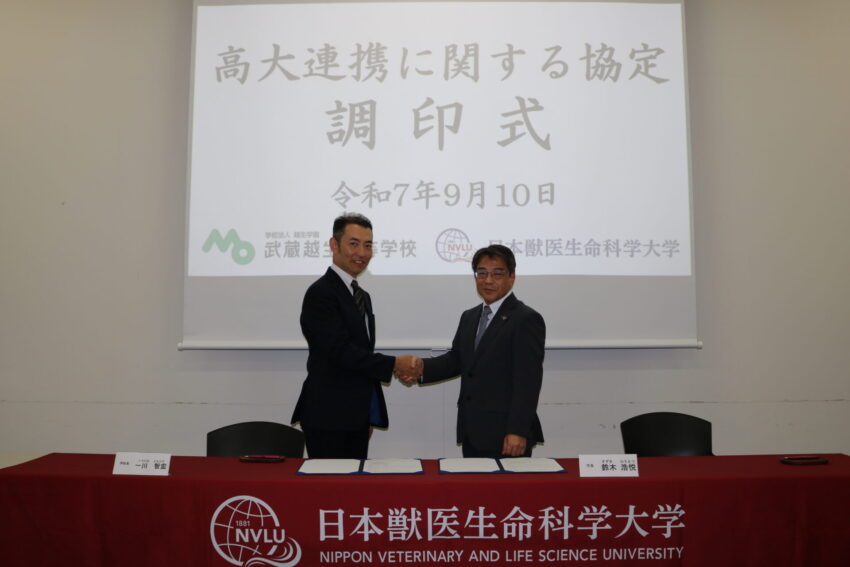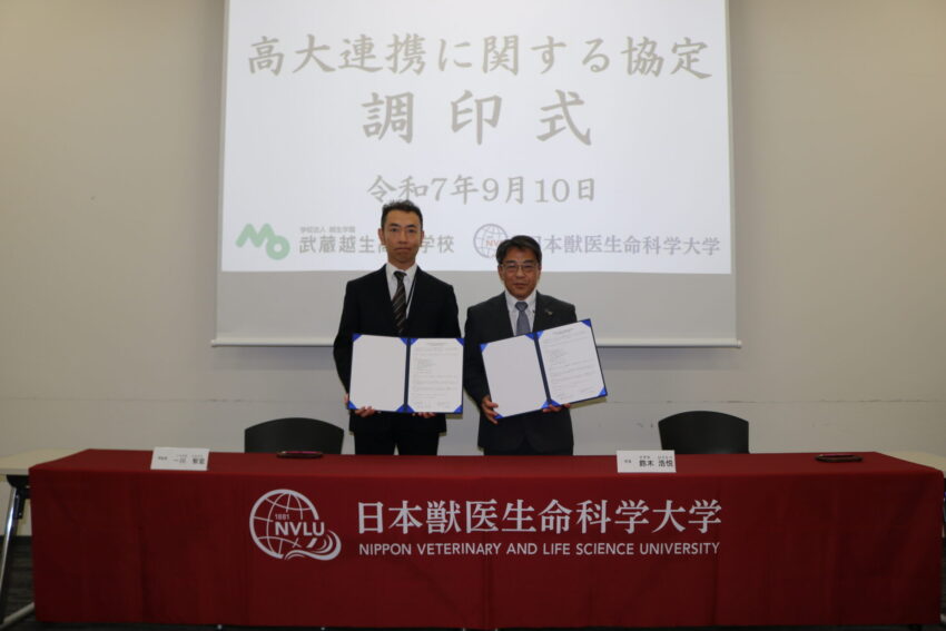 その中でこの度、武蔵越生高等学校と日本獣医生命科学大学は、教育における交流と連携を通じて大学進学に関する本校生徒の意識と学習意欲を高め、双方の教育の質の向上と活性化を図るべく、高大連携協定を締結し、2025年9月10日に調印式を行いました。
