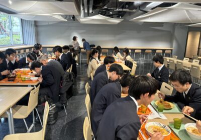 また、授業の後にはキャンパスツアーも実施して頂きました。豊富な蔵書を有する法学資料室や、広々とした教室を、生徒たちも興味をもって見学していました。さらに、お昼には学食も体験させて頂き、ボリュームのあるおいしいメニューを食べて生徒たちも嬉しそうでした。