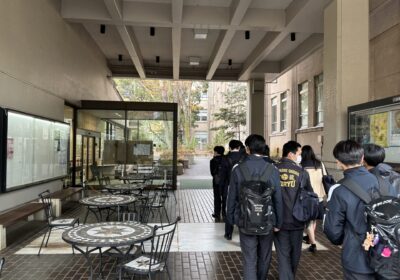 また、授業の後には学生スタッフの皆様によるキャンパスツアーにも参加させて頂きました。約100年の歴史をもつ講堂や、自然豊かなキャンパスを案内していただき、生徒たちも興味をもって見学していました。さらに、お昼には学食も体験させて頂き、ラーメンや定食等の美味しいメニューを頂き、生徒たちも嬉しそうでした。