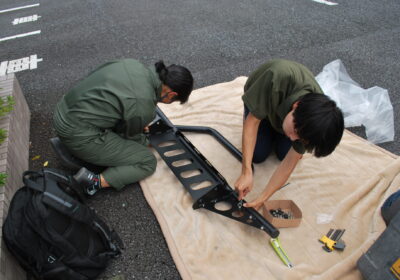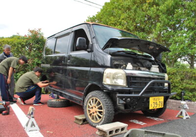 元々ついているバモスのバンパーをグラインダーで切断し、新たな大型バンパーを装着!足回りは、OVER TECHのMAX40(マックスフォーティー)リフトアップキットを選択。構造変更を必要としない40mmのリフトアップを行い、外見が一気に自分たちのイメージする車に近づきました!ちょっとオフロード感も増した?