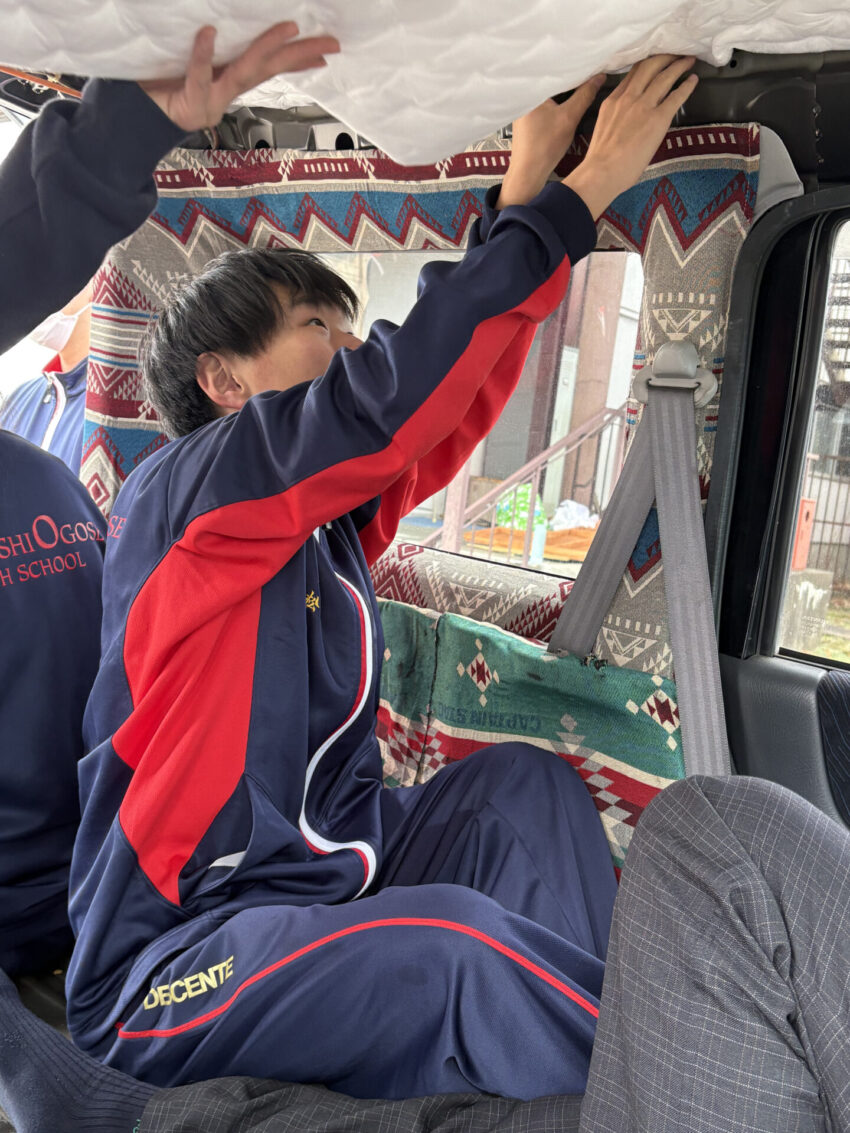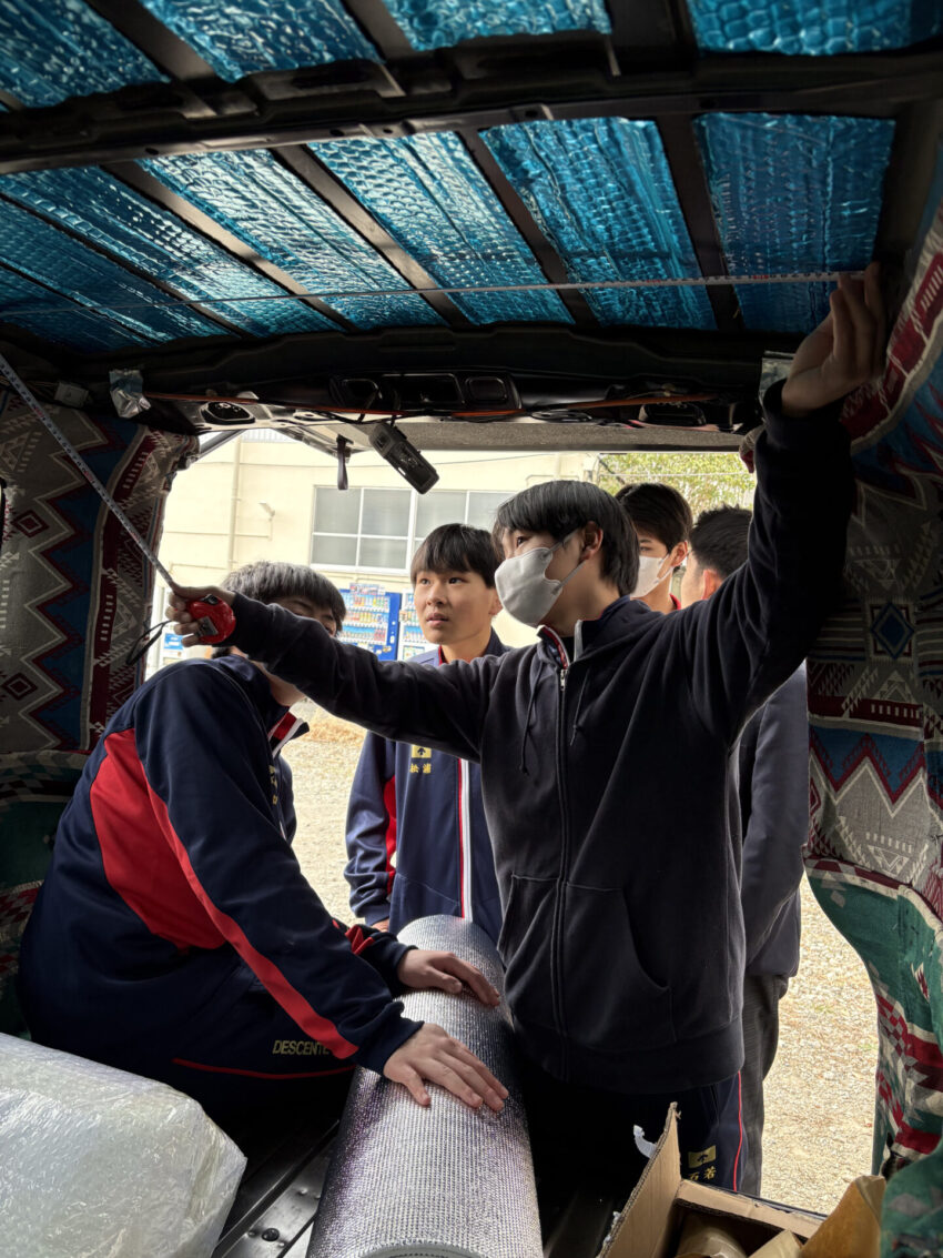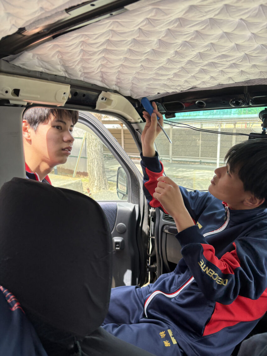 顧問が買ってきた軽バンをキャンピングカー仕様にすることになったのですが、さてさてどんな車なのか…と思いながら、まずはみんなで現車確認。今日はフロアを剥がしたり、寸法計ってみたり、完成形をイメージしたり遊んだり……と、自分たちの理想通りになるのか、乞うご期待!ですね。