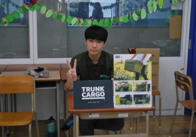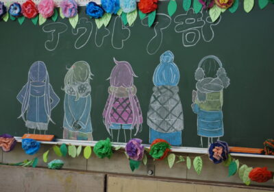 1年7組ではアウトドア部の活動年表のほか、8月に実施したゆるキャン△旅の聖地巡礼マップの掲示、ガルビィの展示や月刊Auto Camperなど、アウトドア部のメディアコラボを多数展示させていただきました。また、キャンプサイト風フォトスポットも設置し、たくさんのお客様に撮影をしていただけました。
