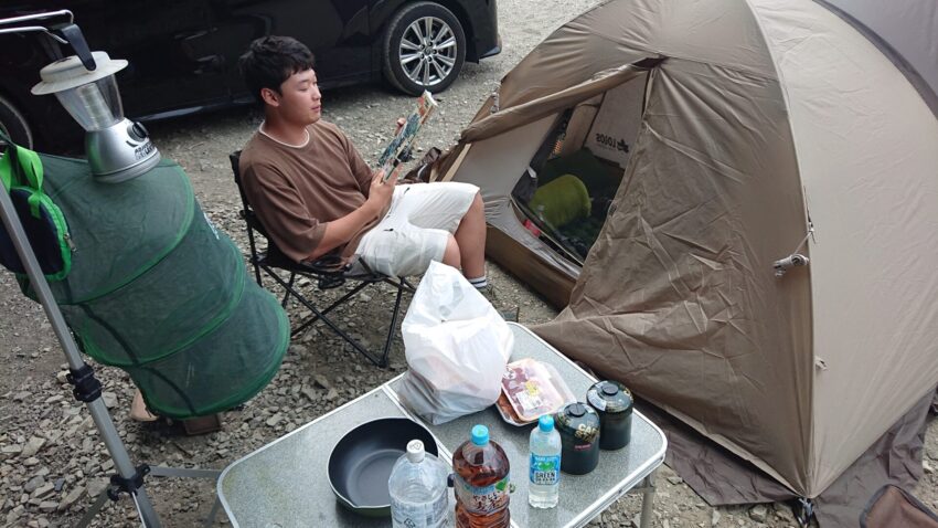 化石発掘キャンプをしていたところ、ちょうどそのキャンプ場では、釣り堀もできたんですね。そしてこうなったわけです「釣りキャンプに行きましょう」と。