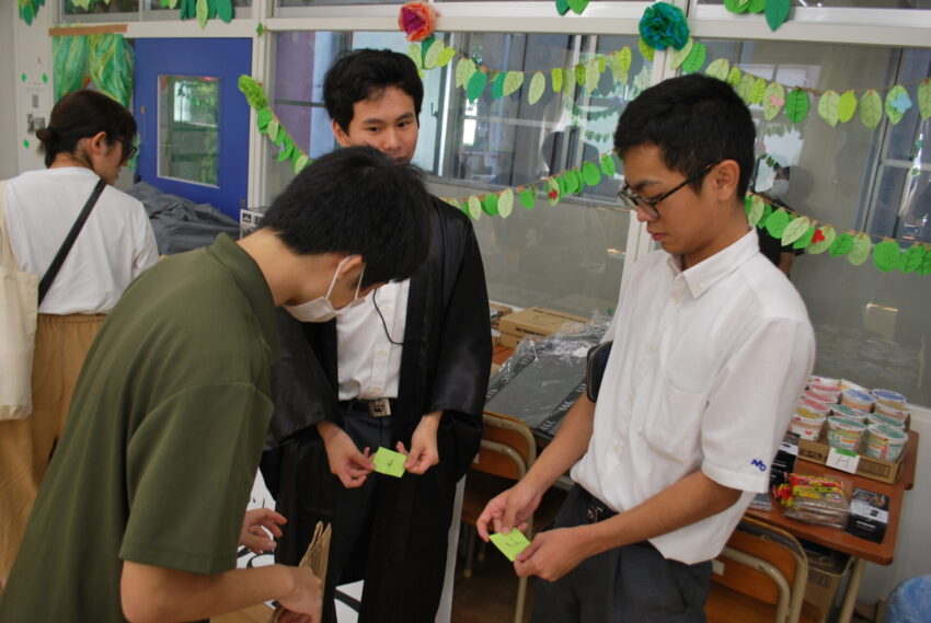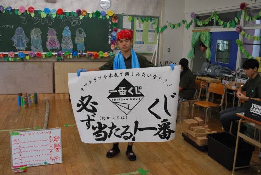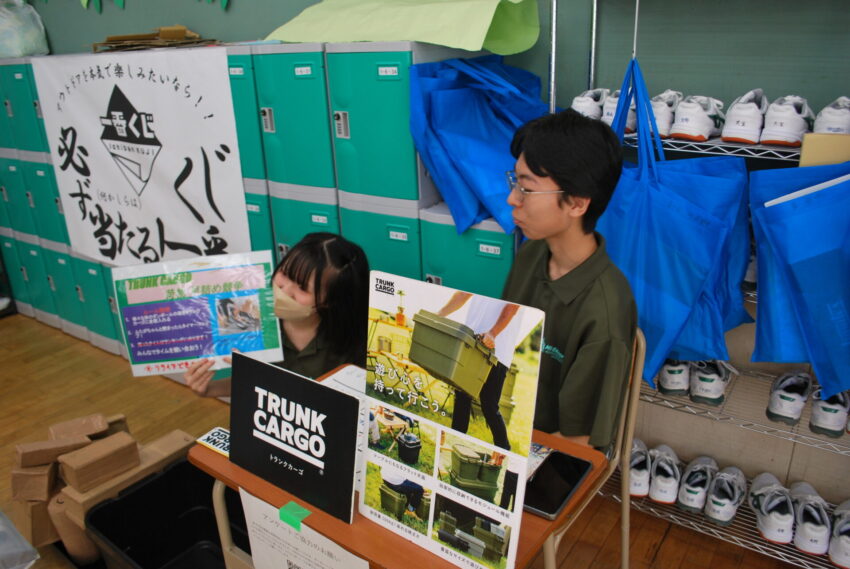 屋内エリアでは、1年6組教室で各種アトラクション関係、2日目は「アウトドアを本気で楽しみたいなら〜絶対に(何かしら)当たる一番くじ〜」を実施しました!2日目のメインイベントとあって、あっという間に完売してしまい、なんとオープンから2時間で全ての景品がなくなってしまうという事態に!引いてくださった方々、ぜひそのギアとともにキャンプへ行ってくださいね!