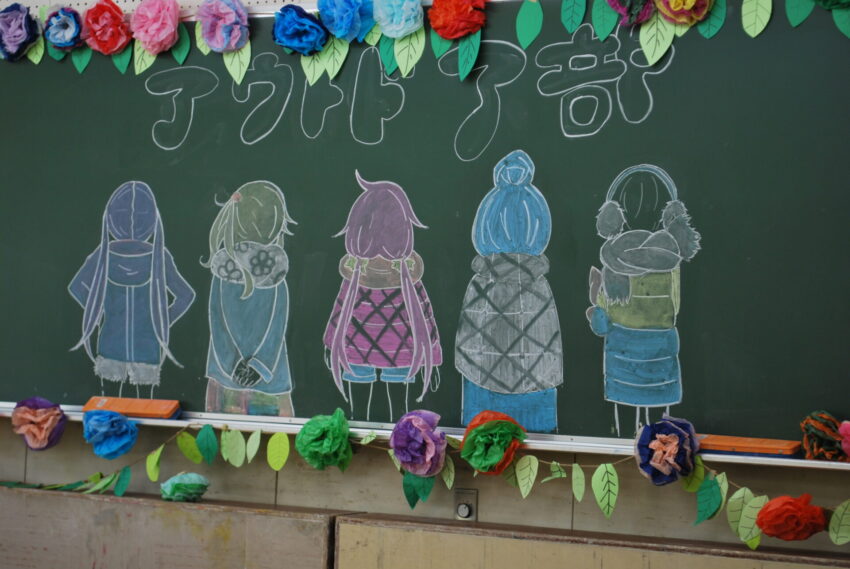 1年7組ではアウトドア部の活動年表のほか、8月に実施したゆるキャン△旅の聖地巡礼マップの掲示、ガルビィの展示や月刊Auto Camperなど、アウトドア部のメディアコラボを多数展示させていただきました。また、キャンプサイト風フォトスポットも設置し、たくさんのお客様に撮影をしていただけました。