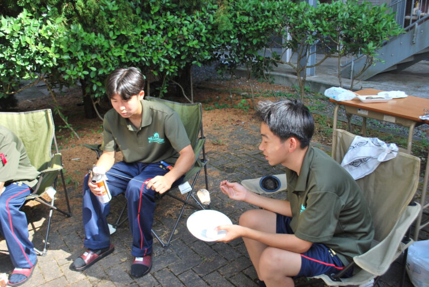 10月は、本校中庭にて、テントの設営や焚き火体験などをします。